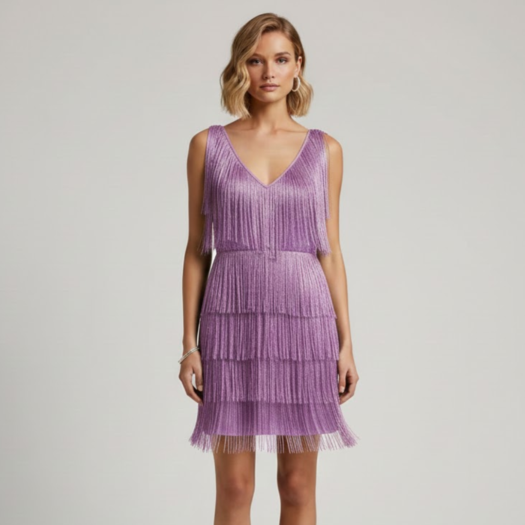 Kæmper du med at finde den perfekte festkjole, der både fanger ramplyst og stadig føles komfortabel? Cerena pailletkjole kombinerer blændende glimmer og legende frynser med en pasform, der giver dig selvtillid hele aftenen